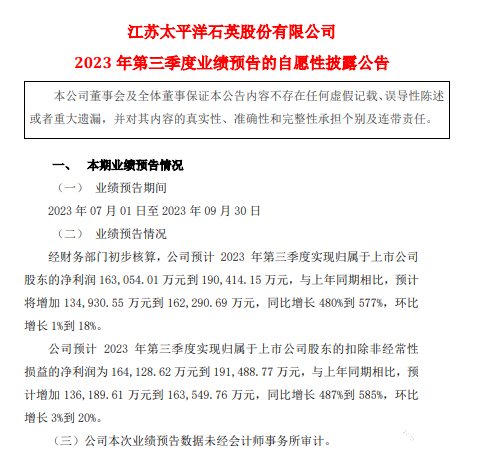 10月9日晚間,石英股份公告,經(jīng)財(cái)務(wù)部門初步核算,公司預(yù)計(jì)2023年第三季度實(shí)現(xiàn)歸屬凈利潤(rùn)16.31億元到19.04億元,與上年同期相比,預(yù)計(jì)將增加13.49億元到16.23億元,同比增長(zhǎng)480%到577%。這主要得益于下游半導(dǎo)體和光伏行業(yè)的快速增長(zhǎng),對(duì)公司業(yè)績(jī)產(chǎn)生了積極的影響。